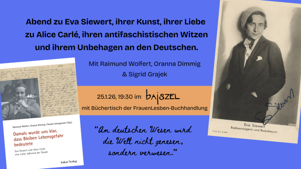 Mit dem von Wolfert, Dimmig und Schoppmann herausgegebenen Buch lässt sich nicht nur eine tragische Liebesgeschichte rekonstruieren, sondern auch eine faszinierende Biografie. Neben der editierten Quellensammlung erinnert auch ein Webprojekt an die Publizistin Siewert. Am 25. Januar würdigen Raimund Wolfert, Oranna Dimmig und Sigrid Grajek Eva Siewert und stellen die historischen Quellen in der Neuköllner Programmschänke Bajzsel vor.